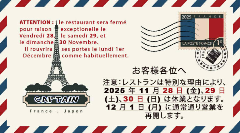 いつもキャプテンをご利用くださり誠にありがとうございます。誠に勝手ながら、2025年11月28日(金)~30日(日)の営業は、お休みとさせていただきます。 12月1日(月)に通常通りの営業を再開いたします。 ご予定をされ […] -